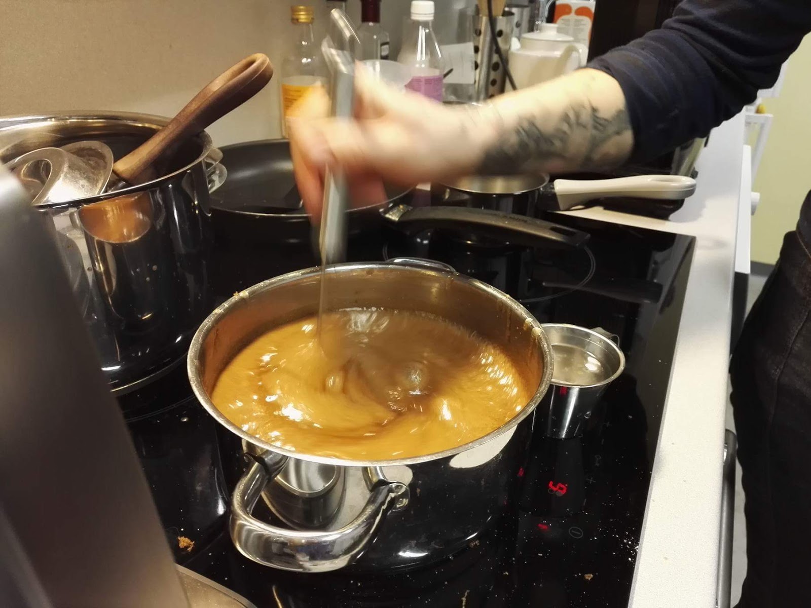 Vatkaa säilykekikherneistä valutettu liemi sähkövatkaimella napakaksi vaahdoksi. Lisää sokeri vähitellen kunnes syntyy kova ja kiiltävä vaahto. Lisää hiljalleen kauravispi ja jatka vatkaamista kunnes massa on vaahtoutunut uudestaan. Sekoita mukaan vielä haluamasi mausteet ja anna jäätyä pakastimessa noin neljä tuntia.